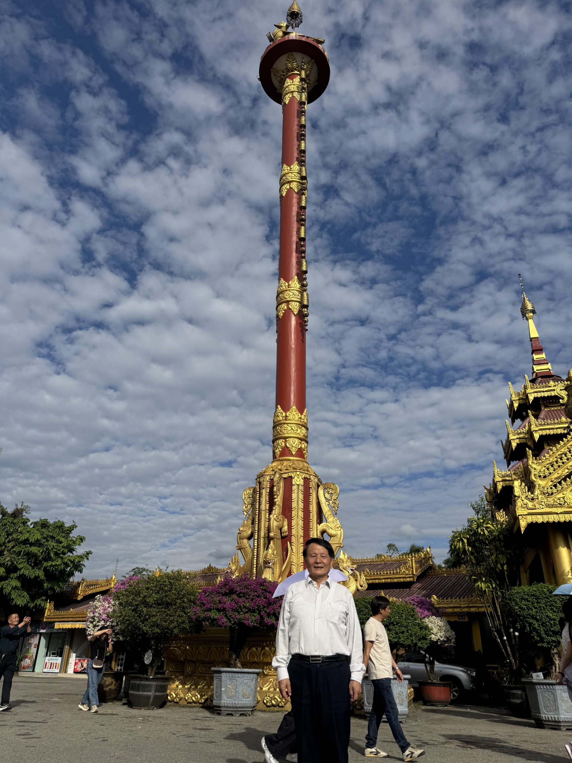 经幡柱融合了缅甸、泰国和中国风格,用于悬挂经幡,具有祈福和传承佛教文化的功能,雕刻精美纹饰,巍峨高耸云天。