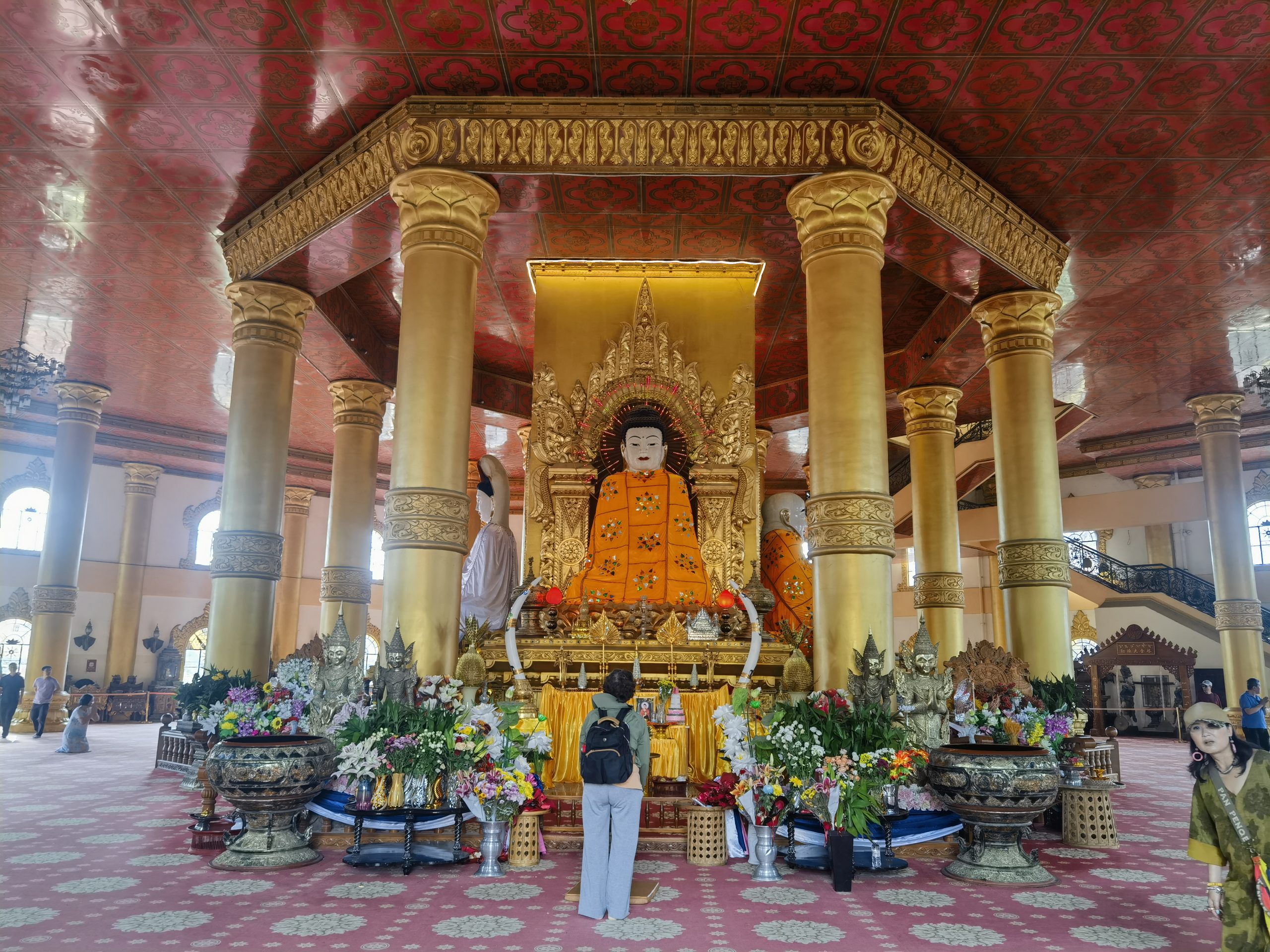 第一层大殿可容纳两千多人同时朝拜,大殿中间塑有四个佛像,东面释迦牟尼佛,南面观音菩萨,西面药师佛,北面弥勒佛,四尊大佛均用整块4米多高的缅甸上等汉白玉雕塑,整个大殿庄严肃穆,金碧辉煌。