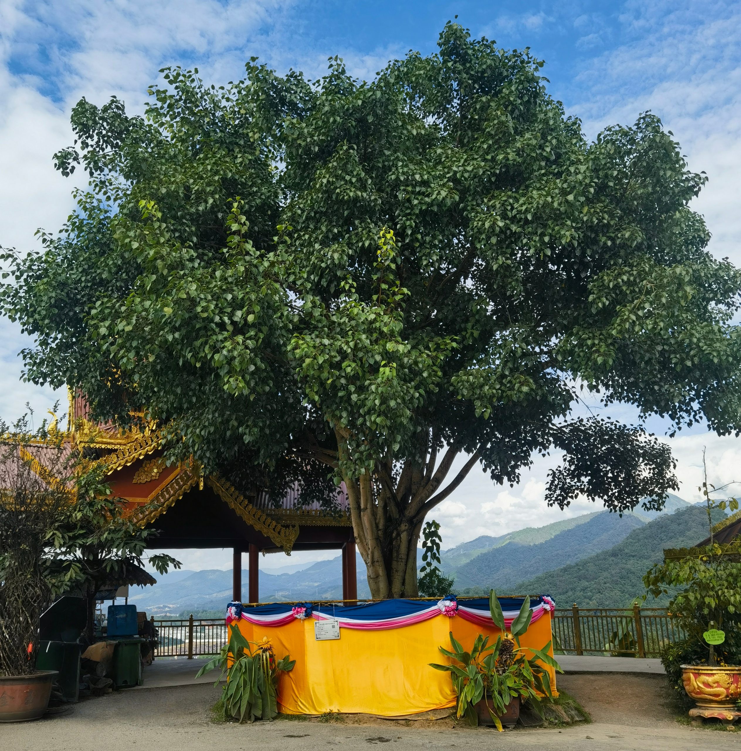 2007年5月1日金塔竣工,举行开光大典和圣安奉种植仪式。这株菩提树苗是斯里兰卡佛协所赠,据说释迦牟尼就是在这棵树的母树下打坐顿悟成佛的,此树是佛祖那株菩提树繁殖的第三代,属孙子辈,讲解员说价值与佛舍利一样珍贵,斯里兰卡佛协仅向云南省佛协赠送了三株菩提树幼苗,分别种于昆明、西双版纳和此地,死了一株,万幸此树成活并长得枝繁叶茂,当地称为圣菩提树。
