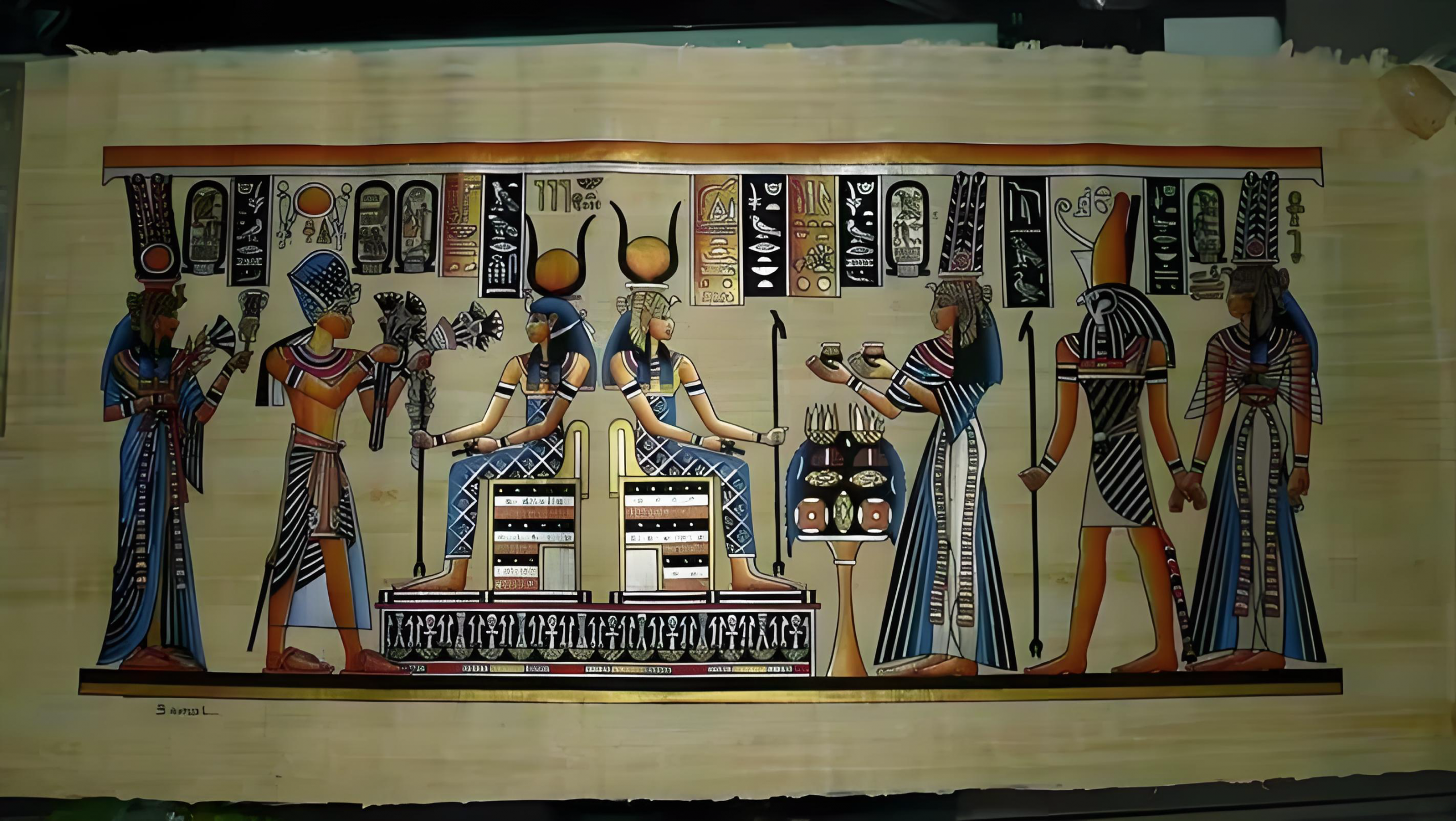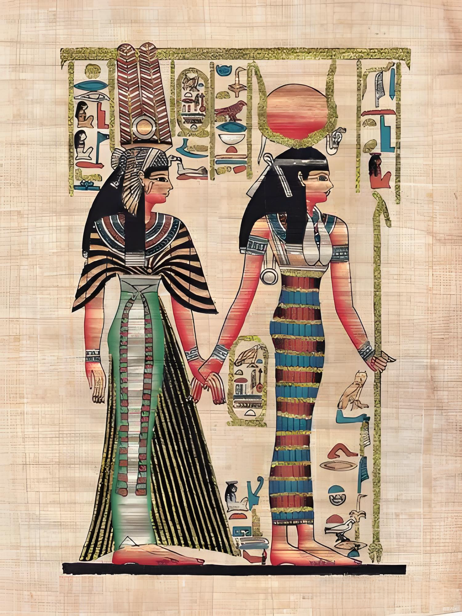 埃及的“纸莎草画”非常有名。在开罗有很多纸莎草画店,在这些专卖店里,纸莎草画是比较贵的,画幅宽或长在一米多的大约报价在1000埃镑(人民币1000多元)左右,大小各种规格的都有,价钱也不一样。纸莎草画店里琳琅满目,很多画从古到今都是很经典的,如生命之树等,就好像中国画里的清明上河图、八骏图等一样。在一些集市或旅游景点叫卖的纸莎草画则很便宜,一二十块钱就能买一张,但有导游说这些画纸不是用纸莎草做的,而是用香蕉皮做的,很短的时间就坏了,所以市场上太便宜的建议大家不要买。