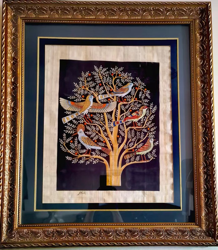 我挑选了一幅“生命之树”纸莎草画,非常有寓意。在一株枝叶繁茂的大树上,栖息着五只幸福和多姿多彩的鸟,这五只鸟分别代表父亲、母亲和子女们。第一,他是最有寓意的“全家福”,表示一个家庭幸福和睦,又给人以联想和艺术美感;第二,他的另一个寓意是,五只鸟分别代表出生、少年、青年、成年和老年,生命循环往复,生生不息,生命之树长青。第三,这颗“生命之树”根深叶茂,郁郁葱葱,意指家庭每个人都健康快乐和整个家庭兴旺发达!我特别喜欢,价钱也合理。我们这个中国旅游团的人基本上人人都买了,到埃及不买纸莎草画是会后悔的。