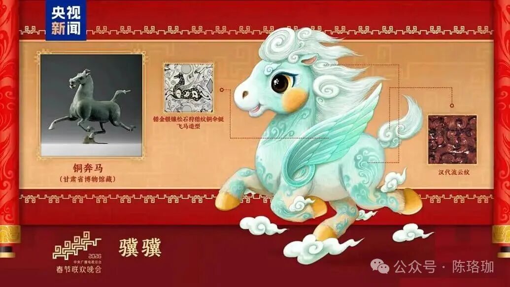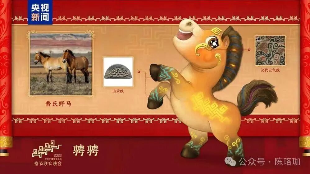 国际国内大型赛事或活动都有吉祥物,今年是马年,中央广播电视总台《2026年春节联欢晚会》推出的吉祥物是四匹骏马:“骐骐”“骥骥”“驰驰”“骋骋”。“骐骥驰骋”源自《楚辞·离骚》“乘骐骥以驰骋兮,来吾道夫先路”(驾驭着日行千里的骏马,在广阔的天地间自由奔驰), 骐骥就是千里马,晚会以马说年,以“骐骥驰骋 势不可挡”为主题,四匹骏马漂亮活泼,喜庆可爱,背后更融入了深厚的中华文化和历史故事,堪称佳作!